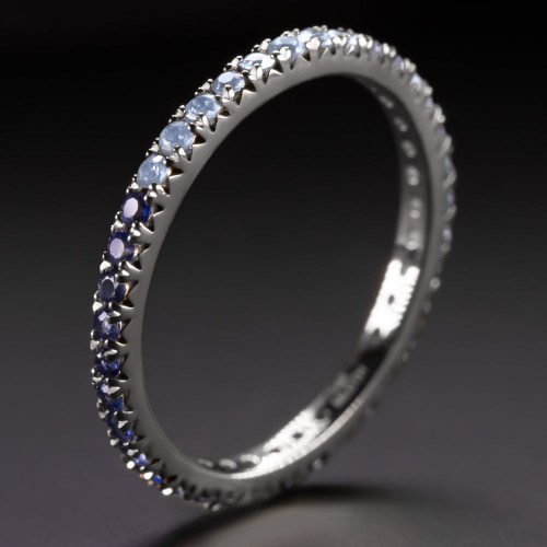 Set with light and dark blue sapphires, this elegant eternity ring offers rich color and timeless design with a modern twist. One half of the ring is set with cornflower sapphires, while the other half of the ring is set with rich deep blue sapphires. This versatile half and half design can be rotated to produce a variety of looks!