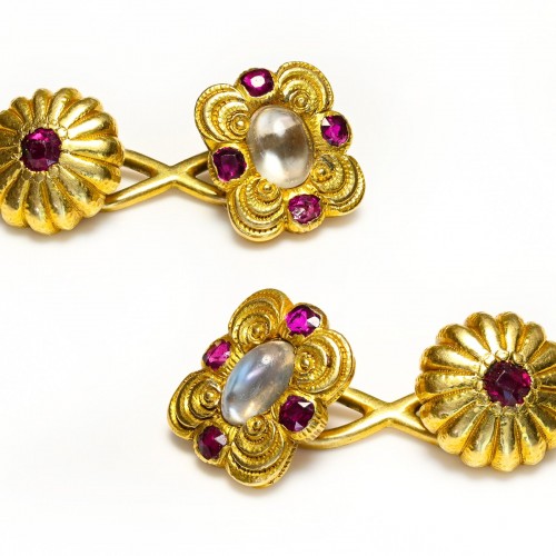 Louis Comfort Tiffany 18K Gold Moonstone & Ruby Cufflinks – A Rare Antique Treasure