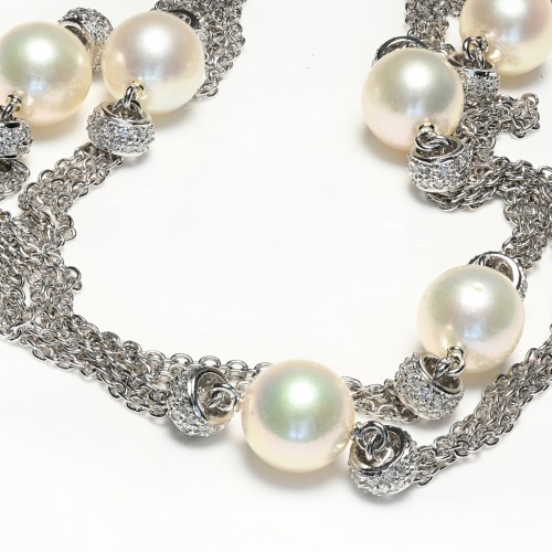 A stunning display of refinement and craftsmanship, this sautoir necklace is a rare statement of enduring elegance. Handcrafted in solid platinum, the piece features a triple-strand platinum chain weighing 48.7 grams, elegantly adorned with luminous 10 mm cultured pearls. Each pearl is framed by diamond-set rondelles, contributing to a total diamond weight of approximately 6 carats.