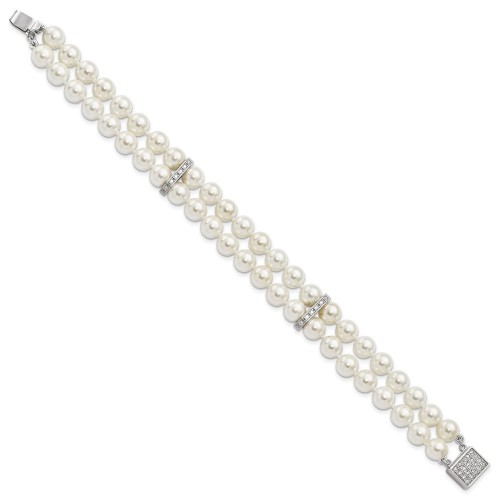 Majestik Sterling Silver Rhodium-plated 7- White Imitation Shell Pearl and CZ Hand-knotted Bracelet 7in 8mm