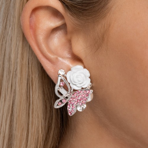 Featuring Primrose, orange, and pink paint, an oversized, white rhinestone-dusted butterfly flutters beside a duo of silver flowers from a silver ring connected to an extended silver chain for a whimsical display below the chest. A lobster clasp hangs from the bottom of the design to allow a name badge or other item to be attached. Features an adjustable clasp closure.