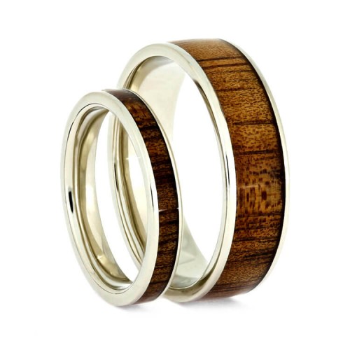 This wooden wedding ring set is perfect for your beach-themed wedding! Hawaiian Koa wood is lined with 14k white gold for a classy yet unconventional look. Whether you share a love for the outdoors or simply admire the tropical wood’s natural beauty, this matching wedding band set makes a colorful statement for you and your partner!