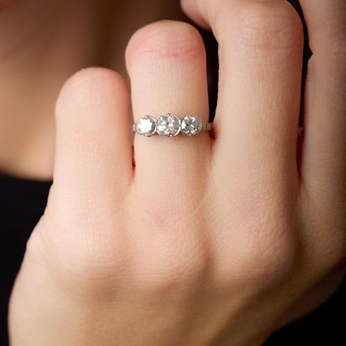 The three-stone arrangement carries deep symbolism, traditionally representing the past, present, and future, while also offering exceptional visual balance across the finger. Transitional cut diamonds are prized for their versatility, displaying broad flashes of light alongside lively brilliance, making this ring both soulful and sophisticated.