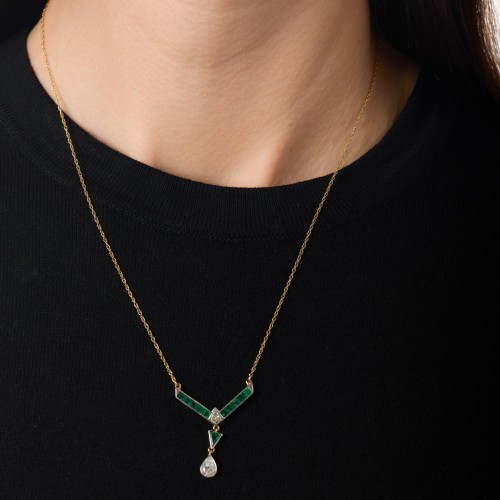 Surrounding the diamonds is a bold arrangement of eleven square and triangle cut emeralds totaling approximately 1.00 carat. Their rich green hue introduces vivid contrast and visual rhythm, reinforcing the era’s fascination with abstract form and modern symmetry. The interplay between the diamonds’ soft glow and the emeralds’ saturated color creates a dynamic composition that feels artistic and intentional.