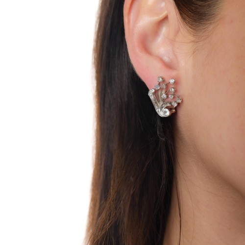 Crafted entirely in polished platinum, the earrings offer a luminous, durable foundation that enhances the diamonds’ brilliance while providing a substantial, luxurious feel. Measuring approximately seven-eighths of an inch, they are perfectly proportioned to make an elegant statement without excess. Timeless, intricate, and exquisitely made, these Mid Century earrings are heirloom-worthy treasures—designed to captivate and endure for generations.