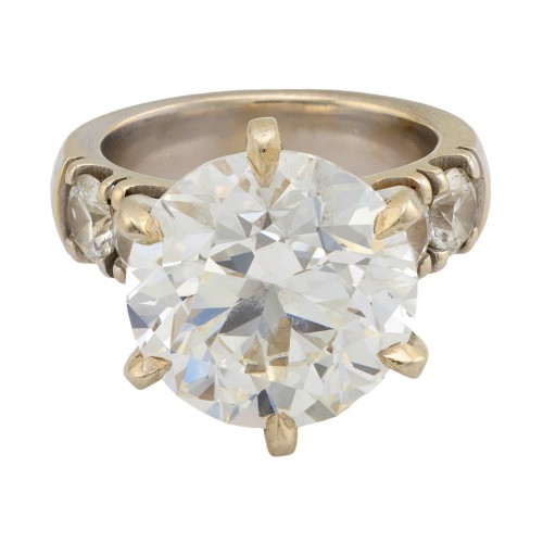 About this Item: Delve into a realm of magic and beauty with this spectacular Mid Century diamond ring. This ring boasts a round brilliant diamond center stone of nine carats! This center stone radiates an absolutely magnificent brilliance like you’ve never seen before and exudes a larger-than-life sparkle. Flanked by tapered baguette cut diamonds to create balance, this 14k white gold ring is truly extraordinary to the average onlooker and diamond experts alike.