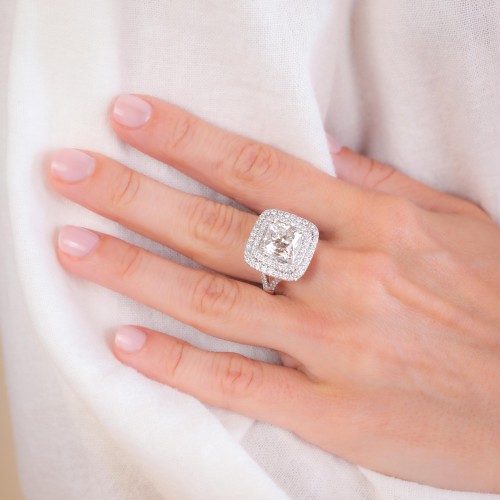 This stunning modern ring from the 2010s showcases a magnificent AGS-certified 5.015-carat dream cushion cut diamond at its center, boasting a beautiful G color and VS2 clarity. Surrounding the center stone are 80 round cut diamonds, totaling 1.28 carats, with exceptional E-F color and VS1 clarity, adding a dazzling brilliance. Crafted from luxurious 18K white gold and marked with engraved stone weights and purity marks, this ring epitomizes contemporary elegance and superior craftsmanship. Sized at 6 1/4 and resizable, with a gram weight of 9.09, it is a breathtaking addition to any fine jewelry collection, blending modern design with timeless beauty.