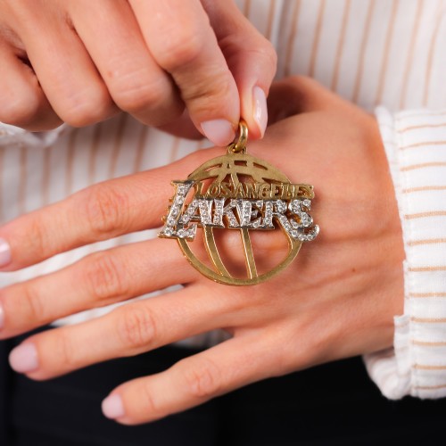 This striking modern Lakers pendant showcases 40 dazzling Round Brilliant Cut diamonds, totaling approximately 1.4 carats, with a color grade of H and clarity grades of VS to SI. Crafted in a luxurious combination of 14K yellow and white gold, this pendant embodies both elegance and team spirit. Measuring 2 x 1 5/8 inches, it makes a bold statement piece that perfectly represents Lakers pride. Whether worn for a special occasion or as an everyday accessory, this pendant is sure to add a touch of sparkle and sophistication to any outfit.