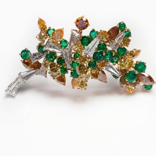 Free from natural fancy diamond and emerald brooch. Crafted with unparalleled artistry, this brooch showcases high-end gemstones of exceptional quality, perfectly complemented by a sleek modernist design. A true testament to sophistication and luxury. Click to View the GIA Identification Report here.