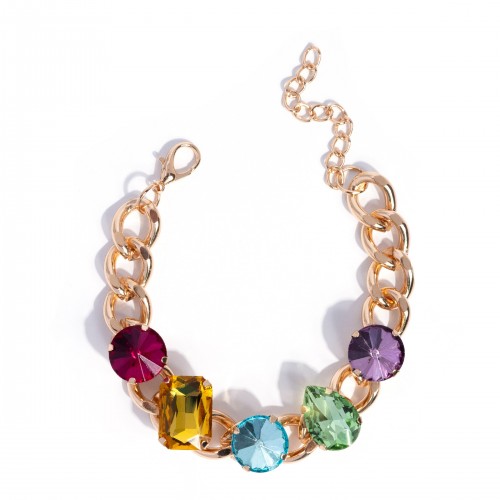 Pronged in gold fittings, a faceted collection of multicolored gems in varying shapes is set atop a gold curb chain for a dramatically dazzling display. Features an adjustable clasp closure.