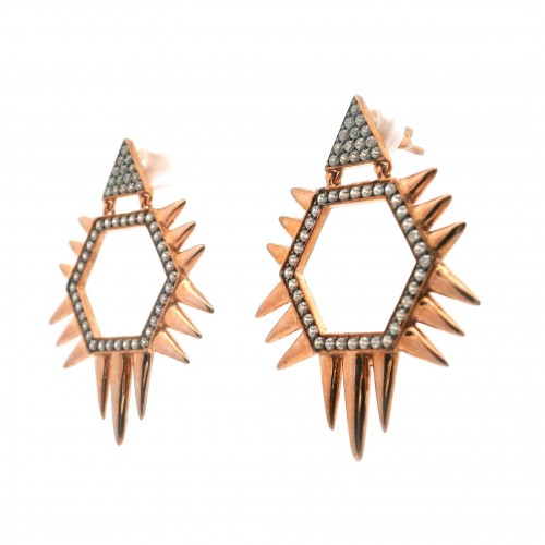Nano Stone Dangle Earrings – Quartz Triangle & Hexagon with Spiky Edges & Rose Gold Overlay over 925 Sterling Silver