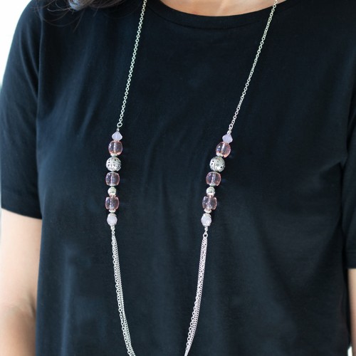 A collection of ornate silver accents and glassy and opaque pink crystal-like beads give way to shimmery silver layers for a refined look. Features an adjustable clasp closure.