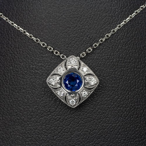 This elegant vintage inspired eternity band beautifully designed to capture the chic style of the Art Deco era! The setting features rich blue natural french cut sapphires meticulously channel set to fit this channel set eternity band. Finished with engraved details, this elegant and unique engraved eternity ring is stunning with brilliant sparkle and a royal blue color! The 14k white gold setting contrasts beautifully with the sapphires. The effect is stylish, striking, and elegant! It is beautiful as a complement to an engagement ring, in a stack, or worn on its own!