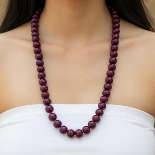 Celebrate timeless beauty and natural elegance with this Ruby gemstone beaded necklace. Crafted with genuine ruby stones, the necklace features smooth, polished beads in a rich crimson color that radiate warmth, passion, and sophistication. The classic design highlights the natural depth and luster of ruby, making it a versatile piece suitable for both everyday wear and special occasions. Known as the July birthstone, ruby is traditionally associated with love, confidence, and vitality, adding meaningful symbolism to its refined appearance. This necklace is perfect for wearing alone as a statement or layering with other gemstone jewelry for an elegant, personalized look.