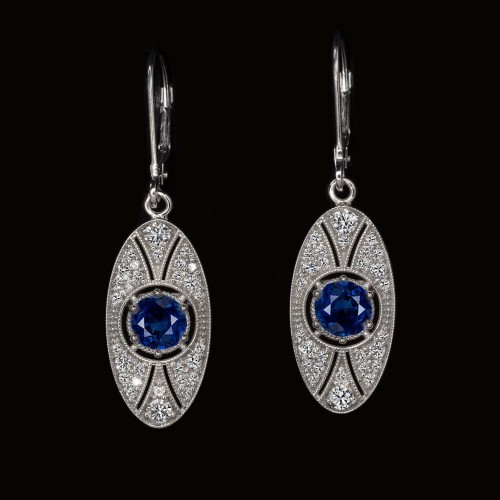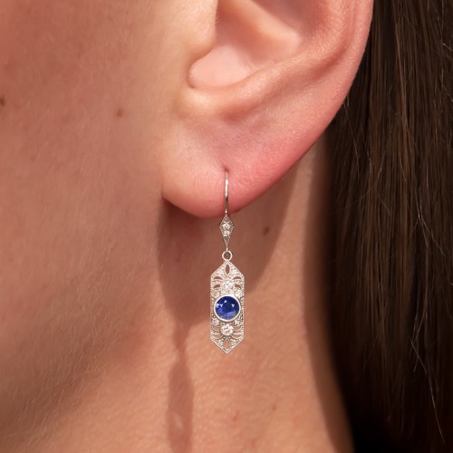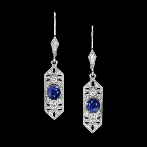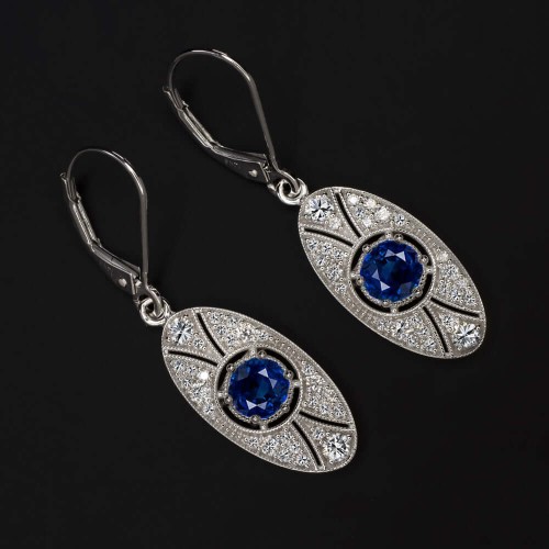 These gorgeous stud earrings feature a 0.47ct pair of old European cut diamonds surrounded by rich blue halos of calibre cut sapphires! Absolutely unique and high quality, these Art Deco style earrings have an air of elegance and sophistication!