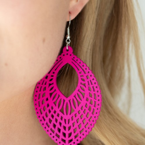 Stenciled in an airy cutout pattern, a teardrop pink wooden frame swings from the ear for a seasonal look. Earring attaches to a standard fishhook fitting.