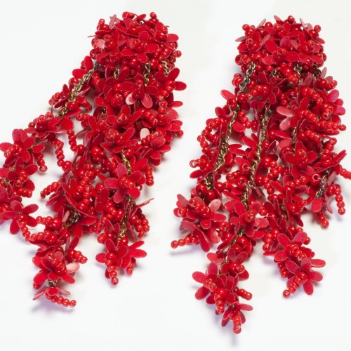 Oscar de la Renta Long Red Glass Beads Flower Tassel Earrings