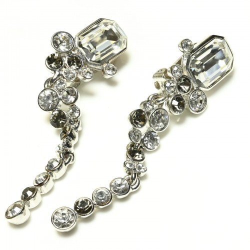 Make an unforgettable entrance with these exquisite drop earrings from Oscar de la Renta, a house synonymous with timeless glamour. Crafted in a lustrous silver-tone finish, each earring features a delicate cascade of faceted gray crystals that catch and reflect the light with every movement.Gracefully sculpted and expertly set, these earrings embody the brand’s signature fusion of modern sophistication and old-world charm. Length 3″.