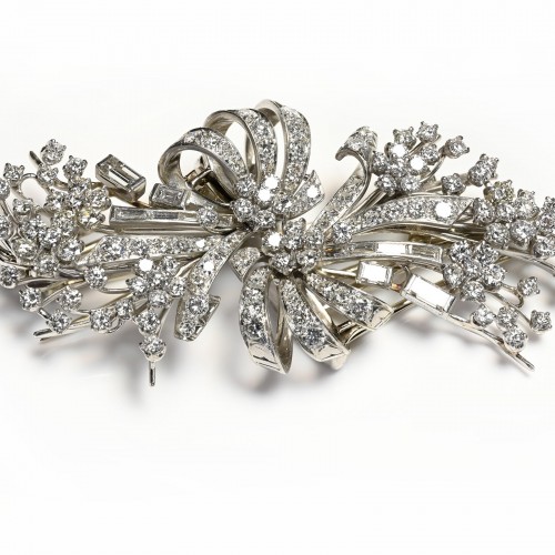 The Platinum Diamond Brooch, crafted by Oscar Heyman & Brothers around July 24, 1946, features a dazzling array of diamonds. It showcases 142 round diamonds totaling 6.27 carats and 12 baguette diamonds weighing 1.11 carats. The total carat weight is 7.38 carats. Serial number 30736. Weight 43.2 Grams. Measures 3″ x 1.35″.