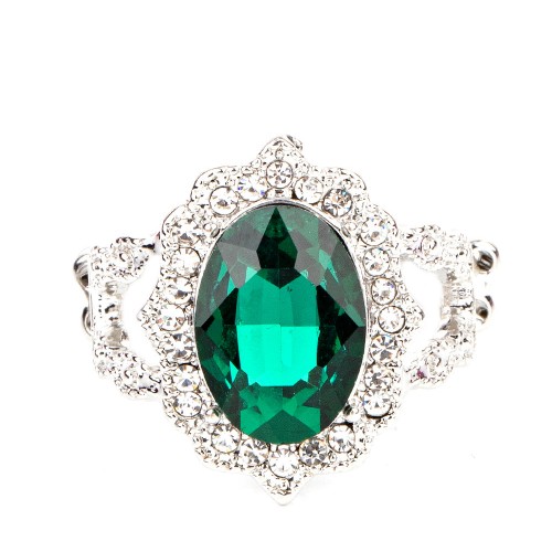 Dotted in dainty white rhinestones, a scalloped silver frame gathers around an oversized green gem atop ornately studded silver bands for a glitzy look. Features a dainty stretchy band for a flexible fit.