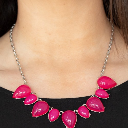 Featuring silver pronged fittings, large and medium glassy pink teardrops fan out below the collar, creating a vibrant fringe. Features an adjustable clasp closure.