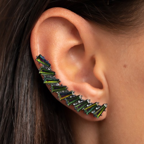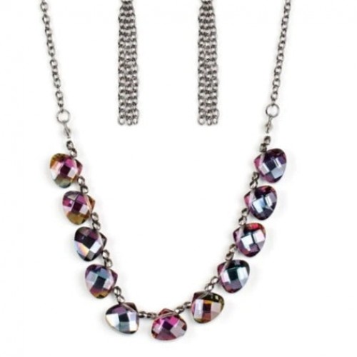 Rounded iridescent teardrop gems join pairs of faceted gunmetal beads below the collar for a refined look. Features an adjustable clasp closure.