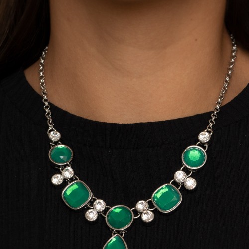 Pairs of glittery white rhinestones, join a sparkly collection of round, square, and dewy teardrop green rhinestones below the collar for a timeless look. Features an adjustable clasp closure.