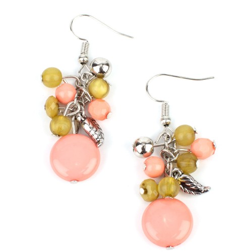 A cluster of Burnt Coral and Willow beads, accented with a shiny silver bead and a delicate silver feather, tumble together atop a flattened Burnt Coral bead for a whimsical finish. Earring attaches to a standard fishhook fitting.