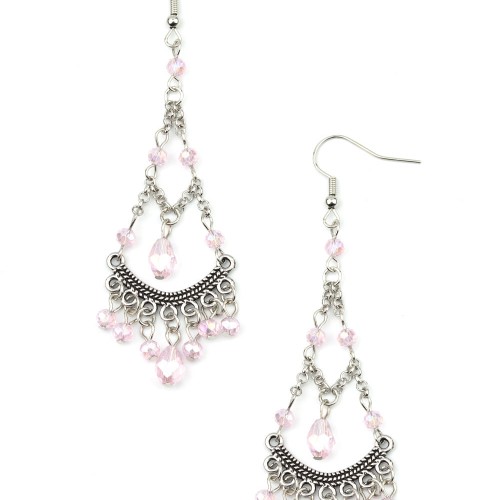 Featuring an iridescent shimmer, a glittery collection of pink crystal-like beads link with shimmery silver chains that give way to a studded silver bar and colorful fringe. Earring attaches to a standard fishhook fitting.