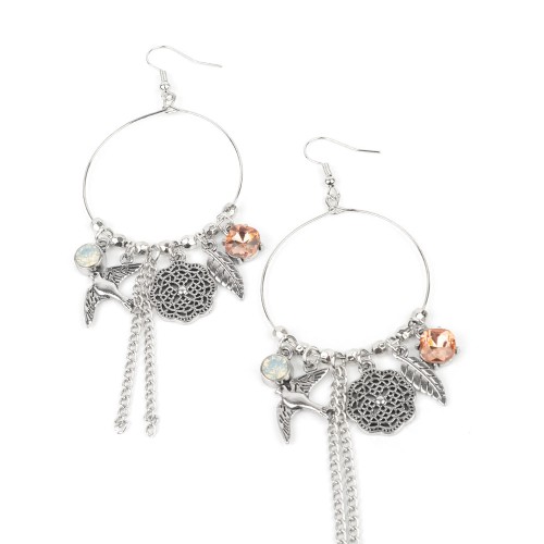 Free-spirited charms, including multicolored gems, a floral medallion, a bird in flight, and a fluttering feather, dangle from a dainty silver ring coalescing into a charming lure. Earring attaches to a standard fishhook fitting.