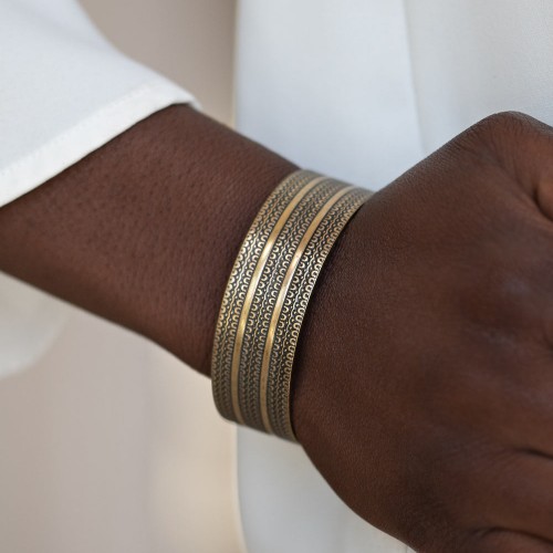Brushed in an antiqued shimmer, flat brass ribbons race across a brass cuff embossed in tactile textures for a tribal inspired flair.