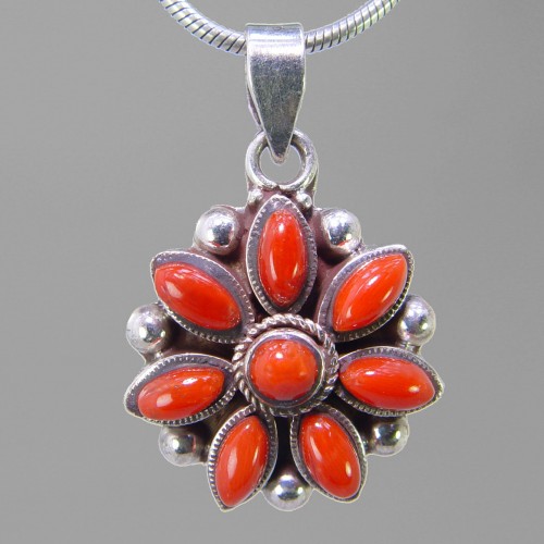 Red Coral 6 ctw Bezel Set With 8 Small Stones Sterling Silver Pendant
