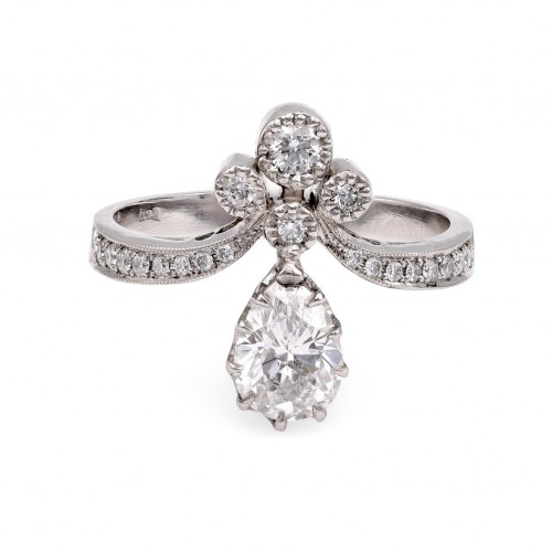 This is a beautiful and bright white platinum and diamond engagement ring set from the 1980s. The sleek matching wedding set showcases a nearly perfect six-prong set Round Brilliant Cut diamond accompanied by an EGL Diamond Report stating the 1.03ct diamond is graded F color and VVS2 clarity. It’s further accented with four Tapered Baguette Cut diamonds along the shoulders totaling approximately 0.15ctw. A custom matching curved wedding band is included with two Tapered Baguette and two Baguette Cut diamonds totaling 0.10ctw in combined weight. The rings are a sleek platinum, highlighting the incredibly white color of the diamonds, a rare find, we are so excited to have a matching engagement and wedding band set!