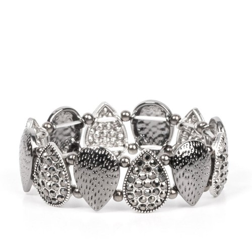 Infused with pairs of gunmetal beads, a decorative collection of hammered gunmetal teardrops, and hematite encrusted silver teardrops alternate along stretchy bands around the wrist for an edgy flair.