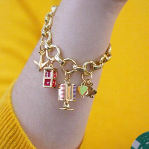 Where the chips fall is totally up to you with this travel-ready mini replica poker chip caddy. The base of the gold vermeil stand is stamped to resemble a poker chip itself with the definitive edge-spot border and the four suits stacked in the center. The caddy is punctuated with alternating indents and stacks of poker chips illustrated in strokes of blue, green, red, and black enamel. We’re all-in!
