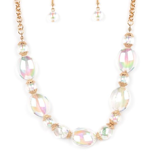 Bubbly iridescent beads in varying sizes drape along the collar, creating a glittery magical effect. Gold cap fittings wrap around the smaller beads, adding vintage metallic detail to the effervescent design. Features an adjustable clasp closure. Due to its prismatic palette, color may vary.