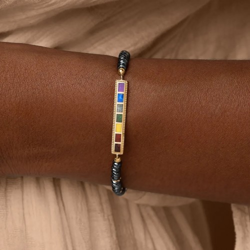 Channel the brilliance of your inner light with the Radiant Flow – Seven Chakra Energy Bracelet. Crafted to awaken balance and positivity, each inlaid gemstone reflects the vibrant flow of life, from grounding Hematite to the intuitive glow of Amethyst. The bar design embodies clarity and strength, while its 18K Hamilton Yellow Gold finish radiates refined warmth. Infused with both artistry and purpose, this stretch bracelet encourages harmony across mind, body, and soul, an elegant reminder of your spiritual alignment and inner power.