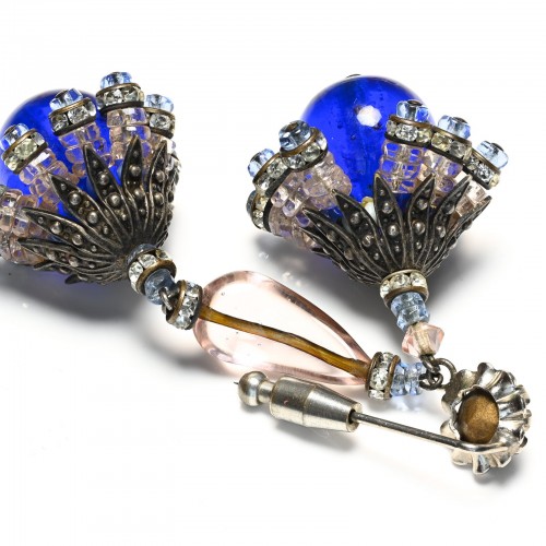 Celebrate the golden age of haute couture with this exquisite 1930’s Elsa Schiaparelli Paris brooch. Meticulously crafted, this rare piece features vivid blue glass beads masterfully arranged to form an enchanting flower design. A testament to Schiaparelli’s bold and imaginative spirit, the brooch captures the avant-garde artistry that made her one of the most influential designers of her era.