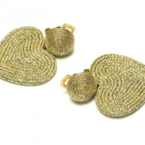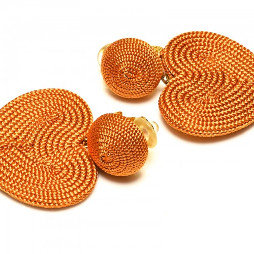 Add a touch of whimsical sophistication to your ensemble with these exquisite heart-shaped drop earrings by Rebecca de Ravenel. Handcrafted with silk-like thread in a radiant gold hue, each earring gracefully sways with every movement, capturing light and attention in equal measure. The sculptural heart silhouette, a signature of the designer’s playful yet refined aesthetic, evokes both romance and bold individuality. Lightweight and dramatic, they are the perfect statement accessory for day-to-evening elegance. Length 2.5 inches.