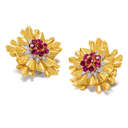 Bold and radiant Retro 14K yellow gold earrings featuring a sculptural starburst design set with vivid rubies and sparkling diamonds. A striking combination of vintage artistry and glamour.