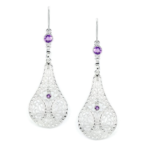 These vintage style earrings feature fuschia rhodolite garnets paired with an elegant sterling silver filigree design. The teardrop shaped dangles feature ethereal, lattice-like filigree. The garnets are natural, earth mined stones.