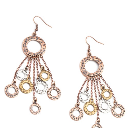 Attached to dainty copper chains, a fringe of hammered brass, copper, and silver rings swings from the bottom of a hammered copper ring for a noise-making statement. Earring attaches to a standard fishhook fitting.