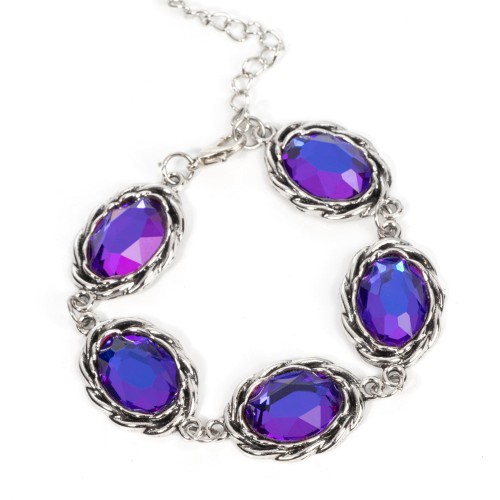 A row of brilliantly faceted gems is encased in layered antiqued silver frames. Featuring a metallic-like finish, the oval multicolored purple gems link end to end for an illustrious appeal around the wrist. Features an adjustable clasp closure.