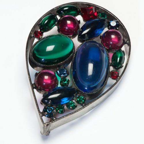 Schreiner New York 1950’s Blue Green Pink Cabochon Red Crystal Teardrop Brooch