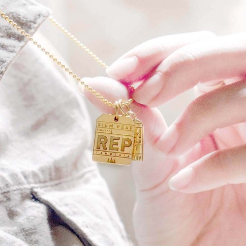 This 14k gold vermeil Asia charm features the IATA code for Siem Reap’s International Airport, REP. This modern Cambodian town lies adjacent to one of the most awe-inspiring complex of ruins on earth. Explore Angkor’s abandoned fortifications, temples and towers, covered in twisting banyan roots, to contemplate the grand ambitions of lost civilizations. The memories will be monumental.