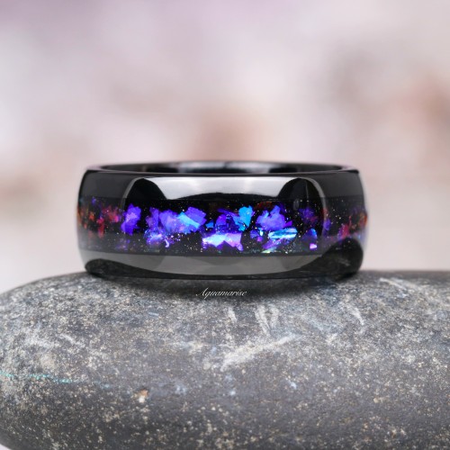 Bold and timeless, the men’s band is forged from ultra-durable polished tungsten carbide with a striking crushed natural abalone inlay, evoking the feel of a cosmic night sky. Designed for both comfort and resilience.