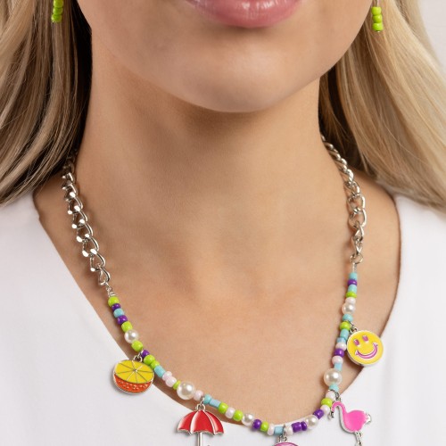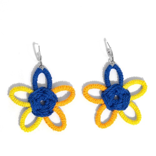 Featuring High Visibility, Persian Jewel, and orange yarn, an oversized flower swings freely from a dainty silver hoop, creating a playful lure. Earring attaches to a standard post fitting. Hoop measures approximately 1/2″ in diameter.