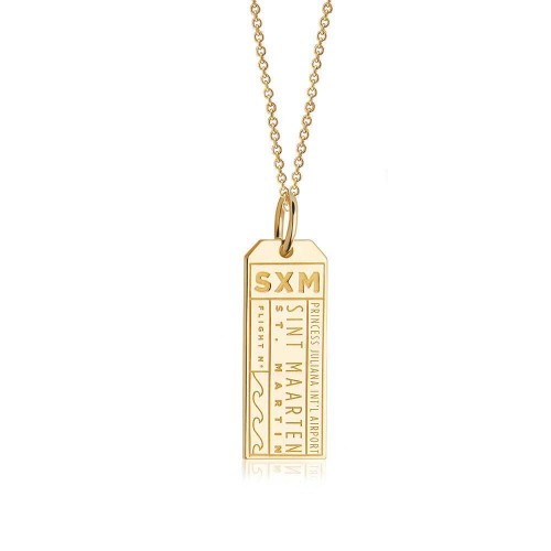 This gold vermeil St. Maarten charm features Ssaint Maarten’s airport code, SXM. On Dutch Saint Maarten, hit the casino tables (after you’ve dodged planes landing over Maho Beach) — then retreat to your secluded villa in the hills of the island’s French side. Here, two beautiful halves add up to an alluring Caribbean whole.