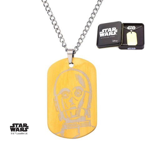 Star Wars 3D C-3PO Face Stainless Steel Gold Plated Dog Tag Pendant Necklace.