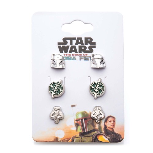 Be the best-accessorized person in the galaxy with these fun Star Wars: The Book of Boba Fett earrings! This 3-piece stainless steel earring set features studs of Boba Fett’s iconic helmet, Boba’s symbol, and a Mythosaur skull. Officially-licensed Star Wars: The Book of Boba Fett earrings.
